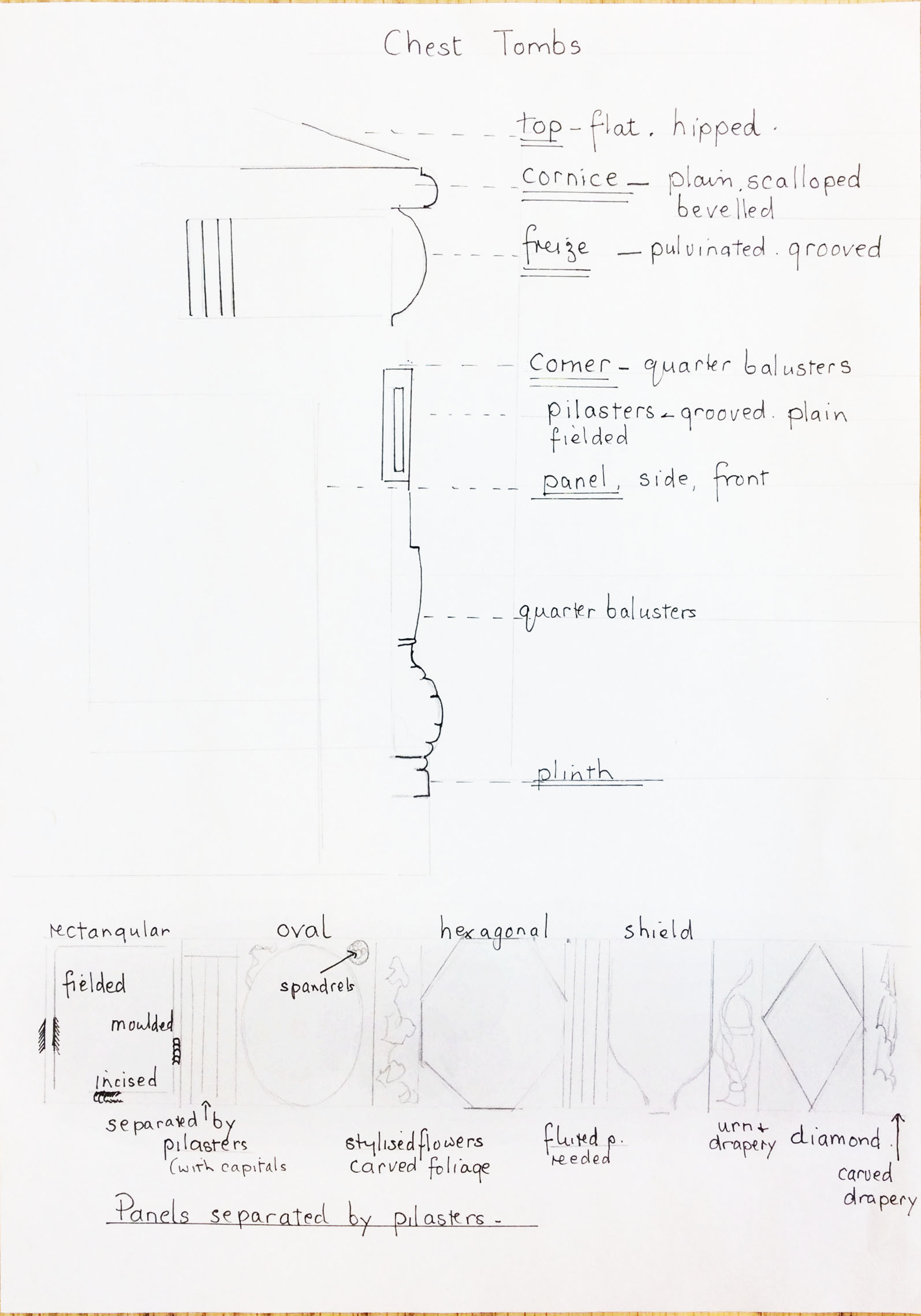 Report: Turf to west side opened. William Fox died 1849, not 1847. Sarah Fox died 1817 - not recorded. The fielded panels are only on the north side. The south side has one central oval panel with stylised leaf decoration in spandrels (2 fielded panels flank(.